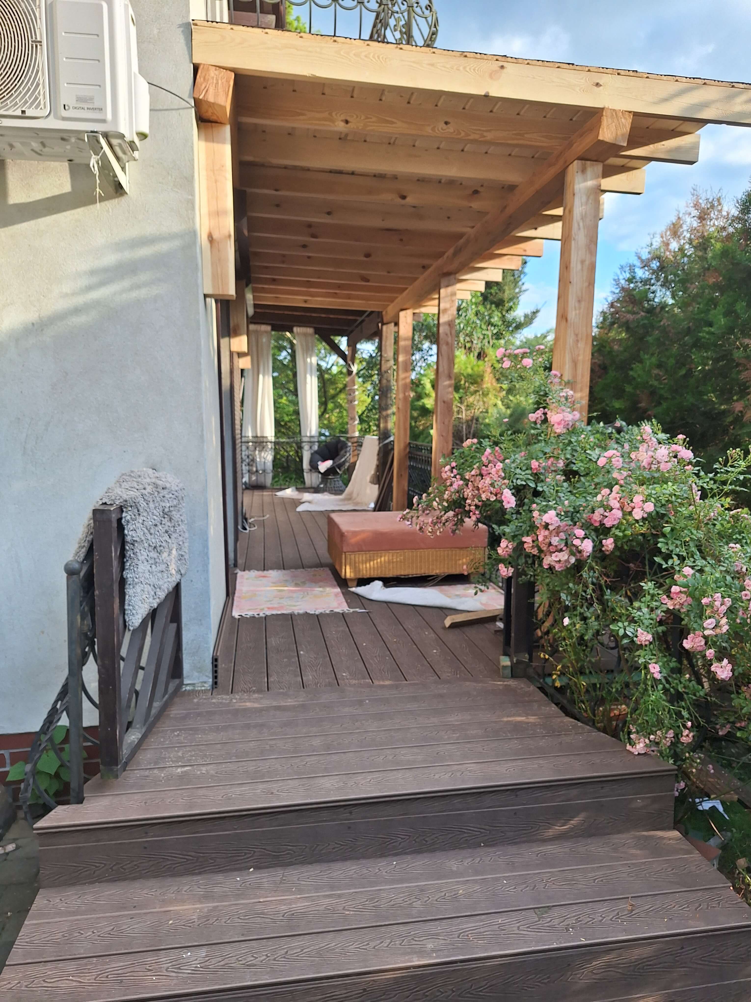 Projektowanie i wykonywanie tarasów z drewna, idealnych do relaksu na świeżym powietrzu, z opcjami dodatkowych elementów, takich jak balustrady i oświetlenie.